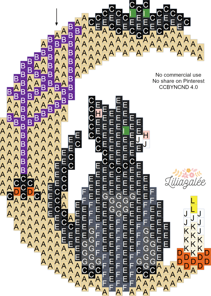 Pour tisser ce diagramme en brickstitch, j’ai commencé par une ligne en point échelle (qui commence à la flèche noire). Ensuite j’ai tissé le côté gauche du diagramme. J’ai ensuite tissé la partie haute de la lune à droite. Et pour finir la partie droite en bas avec le chat.